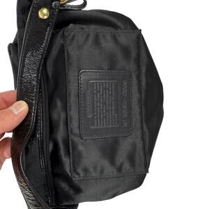 Pre-owned. Good condition. Authentic vintage Coach bag with light normal wear to the hardware. Very light tackiness to the patent leather due to being vintage. It has as a clear interior. From a smoke free home. This is a very cute little black bag with a zip top closure and gold hardware. Measurements are in the pictures.