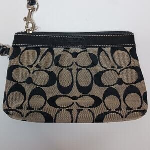 Wristlet from Coach in their signature jacquard print with black leather trim.