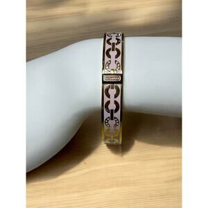 This Coach Signature Metal Enamel and Crystal Bangle from the mid 2000’s features a gold signature design on a light pink background with crystal details. This bracelet would look great with any outfit and if you love the quality and style of Coach, you need this in your collection!