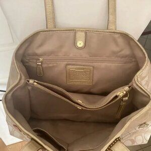 This is a roomy bag ! It measures 16" wide x 9 1/2" tall x 5" deep. It has a zipper compartment on the back wall, a center zippered section and the front wall features 2 pockets. Classy 'signature' style with golden trim. The golden handles have some 'fading' and there are a few marks as shown in the last 3 pictures, but they should come clean with stain remover treatment. Overall in really good shape !