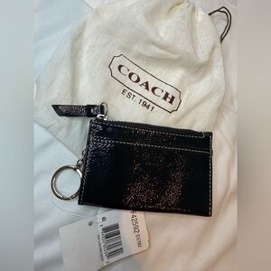Coach Slim Black Patent Leather Top Zip Closure Card Case Holder w/Key Ring NWT