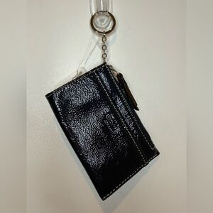 This Coach card wallet is a stylish and practical accessory for any woman. It features a sleek black patent leather exterior and a zip-around top closure to keep your cards secure. The wallet also includes a key ring for added convenience.