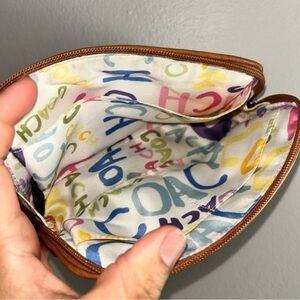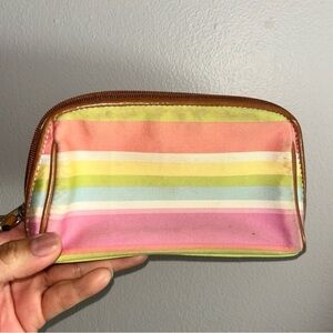 Colorful striped cosmetic pouch by Coach. Features pink, yellow, green, and brown stripes. Perfect for organizing essentials.