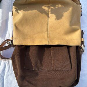 The light brown burnished glovetanned leather on this Coach bag is even better in person-it's so soft! Strap can be worn as a shoulder bag or as a crossbody. Leather exterior has one small pen mark on back and slight sings of wear of the bottom leather corners. Interior has no stains or marks. Bag has been recently cleaned and conditioned. 14"W x 11"H x 5"D