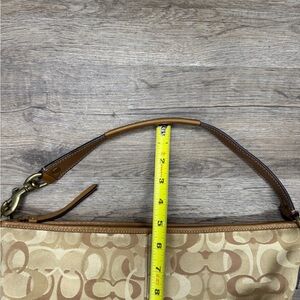 Elevate your style with this Coach shoulder bag, featuring the iconic signature canvas design. The tan and brown colors offer a versatile and timeless look. Perfect for any occasion.