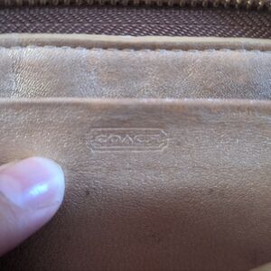 Elegant vintage Coach wallet with signature pattern. Features gold accents and a zip closure.