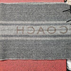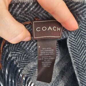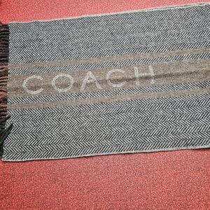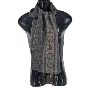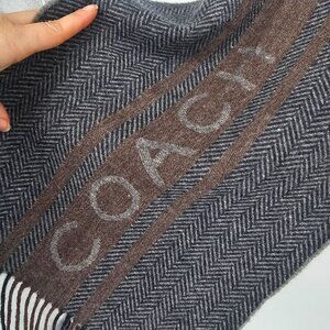 This Coach scarf combines soft wool and cashmere for warmth and style. The herringbone pattern with stripes adds elegance, suitable for various occasions.