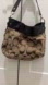 Stylish Coach shoulder bag with signature pattern. Tan, brown, and silver features. Perfect for everyday use.