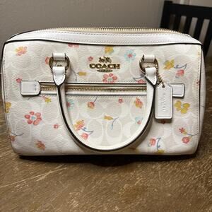 mystic floral, leather satchel, structured bag, signature print, beige, flower motif, classic design, designer accessory, travel bag, elegant style
