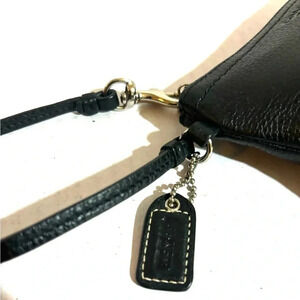 Coach vintage black leather wristlet wallet bag with silver tone hardware main compartment 2 cards slots fabric lining logo at front hangtag at side hight 4.25” wide 6.5”