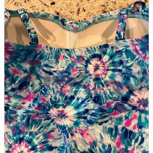 The Coco Contours Clarity Bandeau Tankini Top features our innovative back-smoothing patented Shapemaker® Lining for a sleeker silhouette. The flowing petal hem is flattering and fashionable while molded cups offer additional support. Our psychedelic tie dye print accents this bandeau tankini for luxurious, elegant swimwear.