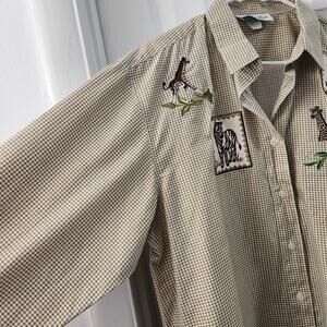 Coconut Row Vintage Safari Embroidered Button Down Shirt L Gingham Retro