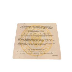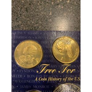 This is a set of 7 gold-colored brass coins, each featuring a different U.S. President. The coins are approximately 1 inch in diameter and have a raised image of the President on one side and a description of their presidency on the other. The coins are packaged in a blue and gold cardboard display card with the title "Free For You - A Coin History of the U.S. Presidents." The card lists all of the U.S. Presidents and includes the Reader's Digest logo and copyright information. The coins are in new condition, but the packaging is slightly worn. The set is missing the original tags and box.