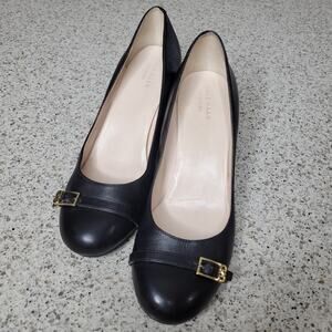 Cole Haan Grand OS Black Leather Closed Round Toe Gold Buckle Wedge Heel✨️9B