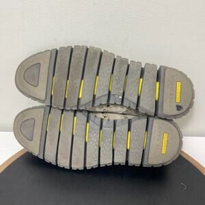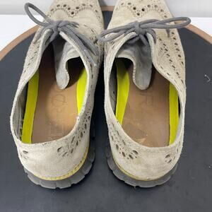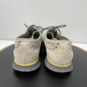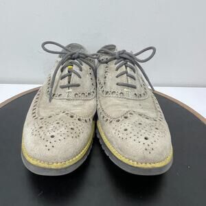 Stylish Cole Haan wingtip oxford dress shoes, perfect for adding a touch of sophistication to your wardrobe. These shoes feature a classic wingtip design with decorative perforations and a lace-up closure for a secure fit. The neutral gray suede leather offers a versatile look, making them easy to pair with both casual and more formal outfits. The unique sole is constructed of durable material, and has a thin yellow strip on the side. Ideal for smart-casual work environments, weekend outings, or semi-formal events where comfort and style are key.