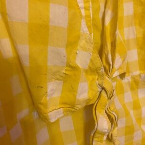 Yellow gingham (100% Cotton). Romper. Short sleeves. V-neckline. Front button closure. Side pockets. 3.5" inseam. 11.5" front rise. 26" leg opening. Imported.