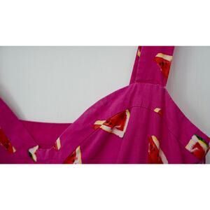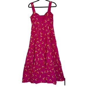 Pink melon printed cotton poplin (97% cotton 3% SP). Maxi. Sleeveless. Sweetheart neckline. Invisible side zipper. Hook-and-eye closure. Partially lined. 54" from shoulder to hemline. Imported