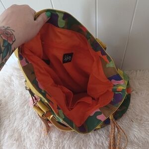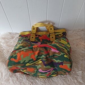Colorful camouflage canvas tote bag with mustard yellow handles.