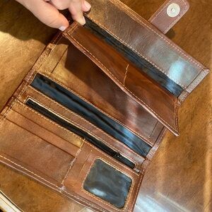 Vibrant clutch featuring a colorful geometric pattern and brown leather trim. Perfect for adding a pop of color to any outfit.
