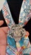 Vibrant silk scarf featuring a tiger brooch. Colors include blue, pink, and yellow.