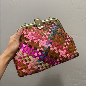 Colorful Genuine Woven Leather Retro Metal Frame & Push Lock Handbag, Crossbody