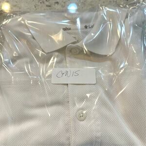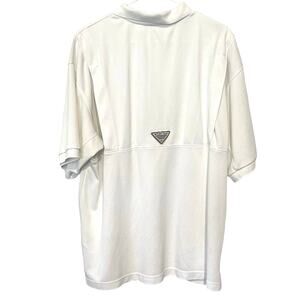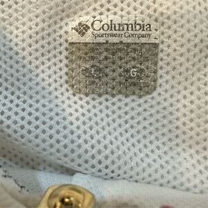 Keywords: Columbia, men's polo, white polo, golf shirt, casual wear, breathable, polyester, short sleeve, collared, machine washable, pre-owned, size large, regular fit, sportswear, button placket.