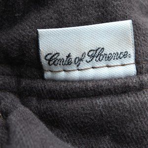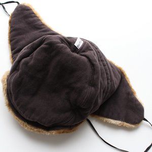 Authentic, preowned Conte of Florence trapper hat.  Made from cotton, it features a brown sueded cotton exterior with faux fur trim at the band and ear flaps.