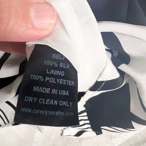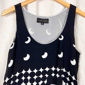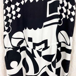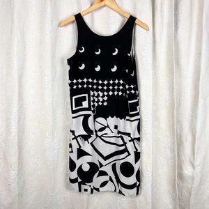 Corey Lynn Calter silk black & white geometric shift dress retro 60s cocktail, size Medium. Fully lined, pull-on style, with moons and other abstract prints throughout. Dry clean.