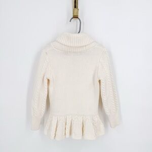 Stylish cream knit cardigan with black buttons. Features a shawl collar and peplum hem.
