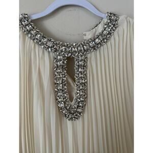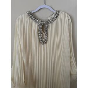 Cream pleated dress with feathered sleeves and beaded neck size small
