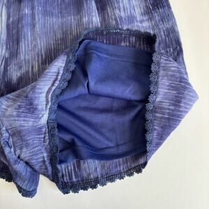 Features: Crescent Blue Tie Dye Boho Style Sleeveless Surplice Neckline Romper; sleeveless with lace trim, surplice v-neck, elastic waistline with stretch, lined shorts.