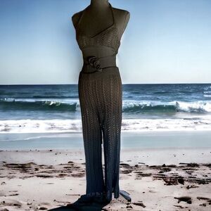 NEW WITHOUT TAGS Material Polyester/Spandex includes halter bikini top self tie & matching high waist, hollow out fishnet style ankle length long pants. Approximate measurements pants Waist 31” Length 32. 100% Acrylic (Stretchy)