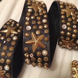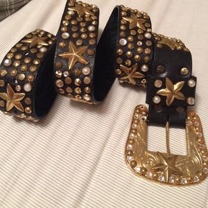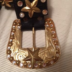Genuine leather belt with a gold toned buckle with crystals. The belt has gold toned studs along with crystals. No doubt this belt will stand out with any pair of jeans! It was purchased in Nashville at over $400! No longer fits my waist :(