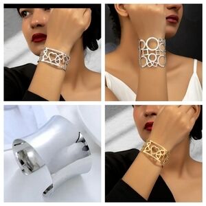 This silver-tone heart cuff bracelet showcases a bold geometric design with intricate cut-out patterns, creating an open and airy look. Its substantial width and polished finish make it a standout statement piece, reflecting light beautifully. The modern architectural style adds a sophisticated touch to any ensemble.