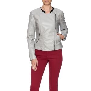 Cupcakes and Cashmere Kadence gray vegan leather moto jacket. Light Grey leather jacket with zipper detail throughout, off center zip closure and side pockets. Quilted accents on the shoulders.