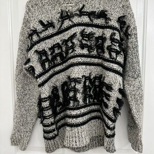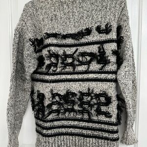 Black/off white color with amazing fringe trim front and back. Crew neck style. Wool/cashmere blend. I'm selling a sample version of the sweater, which is why it does not have content or care instructions, only worn 3-5x.