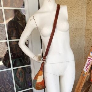 Cute retro patchwork leather crossbody bag by Fossil. Featuring multicolor patches, inside zipper compartment, back zipper pocket, zipper top closure, silver hardware, classic key charm, adjustable strap, this crossbody is leather and canvas. marks but part of distressed look. Measurements: Width 12 inches; Height 10.5 inches; Depth 2.5 inches; Handle Drop 23 inches,🤩please look at the last picture signs of wear
