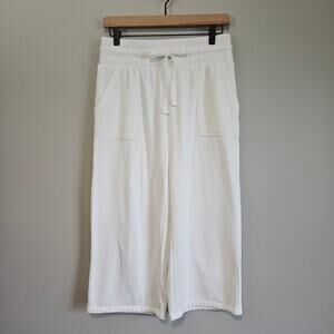 Notes: White cropped wide-leg lounge pants with drawstring waist, elastic waistband, and front patch pockets. Lightweight, comfy, and versatile. See photos.