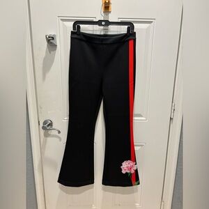 The Bonded pants from Cynthia Rowley highlight a flared silhouette and a high-rise waist. An intricate flower accents a contrasting tuxedo stripe design.
