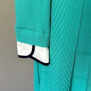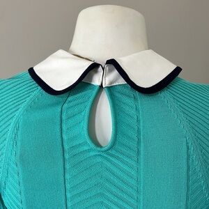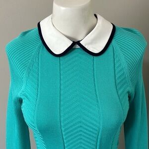 Textured panels add fun dimension to a fresh-hued sweater-dress flourished with a satin-trimmed collar and matching cuffs.