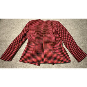 1980s red and black houndstooth blazer. Wool with a synthetic lining. Long sleeves with padded shoulders. Nipped waist with two button closure. Peaked front hem. V neckline with no lapels.