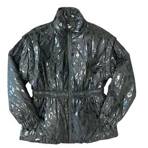 DKNY Glossy Leopard Print Puffer Jacket Women’s M Black Cinched Waist