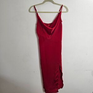 D&M Red Sexy Spaghetti Strap Drape Neck Front Slit Back Zip Satin Dress Small