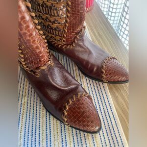Stylish brown woven leather cowboy boots. Unique design with intricate patterns.