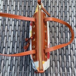 Super fun white canvas shoulder bag by Dooney & Bourke featuring a painted multi-color graffiti print. Chestnut colored leather handles and trim with leather lacing and tassels. Zip close with two interior slip pockets.