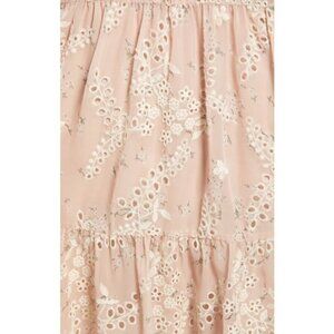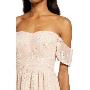 Eyelet details integrate beautifully into the soft floral print of an off-the-shoulder dress that's polished off with a gracefully tiered hem.