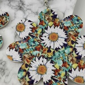 Daisy Flower Printed Leather Drop Dangle Earrings Lightweight Blue Multicolor