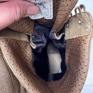• Flaws: Light stains around soles and laces, re-stitching visible at fabric tongue (see photo), some cracks inside the trim near lacing holes