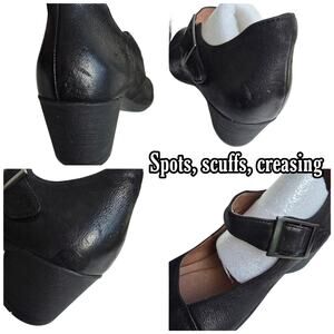Black leather upper. MaryJane strap w/ velcro closure & decorative buckle. Round toe, cushioned comfort insole. Chunky heel. Issues noted in photos. Very good preowned condition,  overall. US Size 7.5 - 8, EU 38 by Dansko. Style: Roxanne.