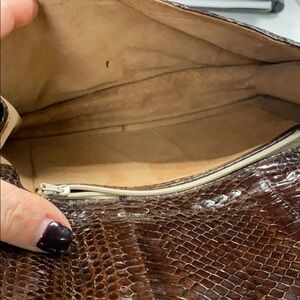 snakeskin with the exception of the beige suede with zipper pocket interior. 9.5” x 5.25” x expands to 1.75” deep. Goldtone snap closure locks and opens perfectly